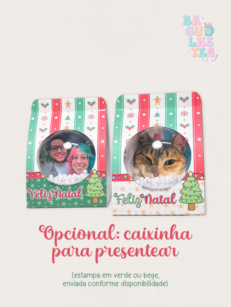 – Interior: foto personalizada de um lado + ilustração de natal no verso + flocos de isopor